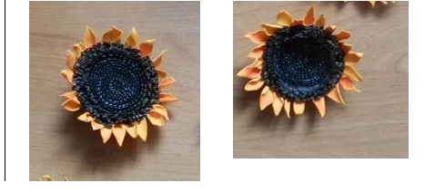 Проклеиваем лепестки по кругу сердцевины подсолнуха и получаем лицевую сторону цветка.